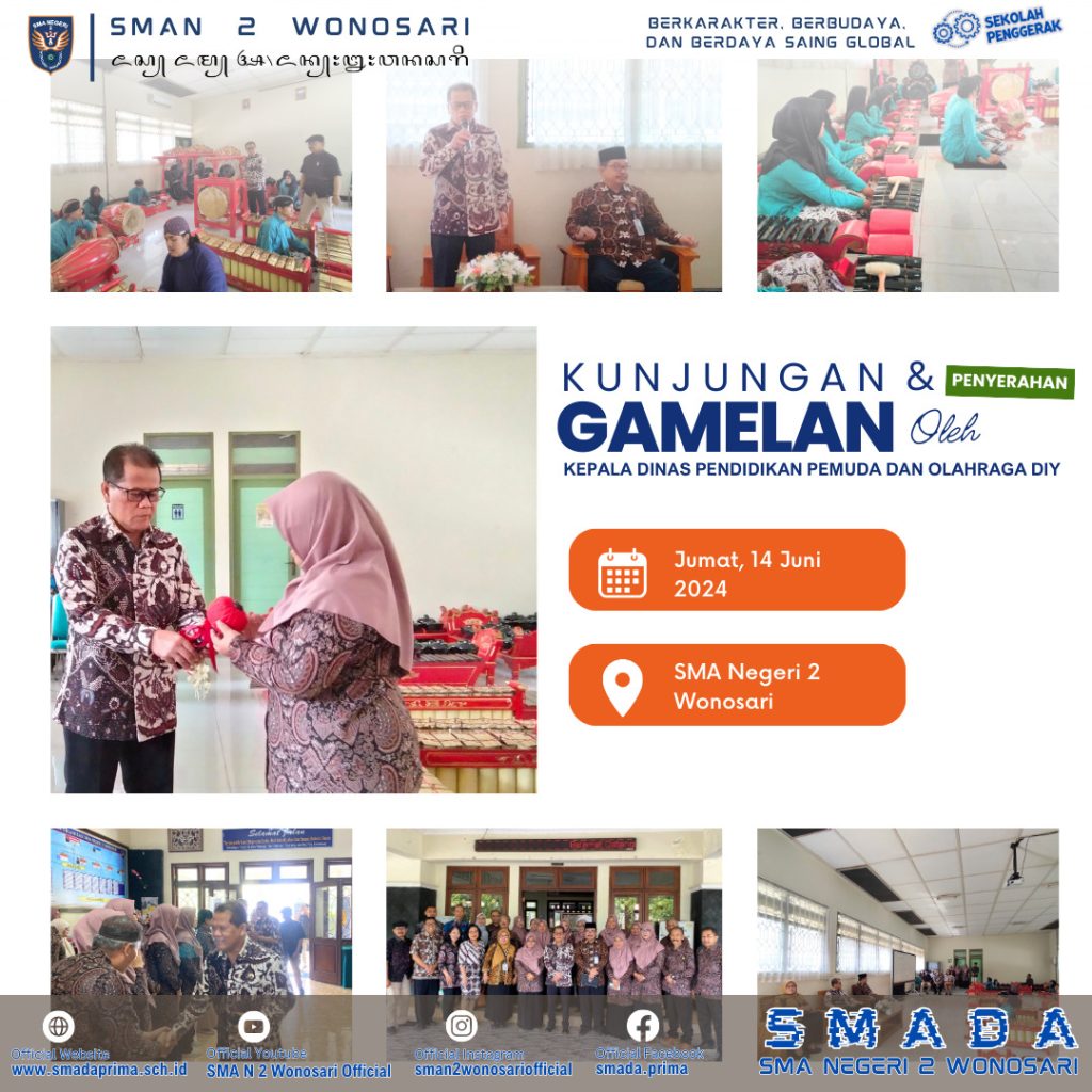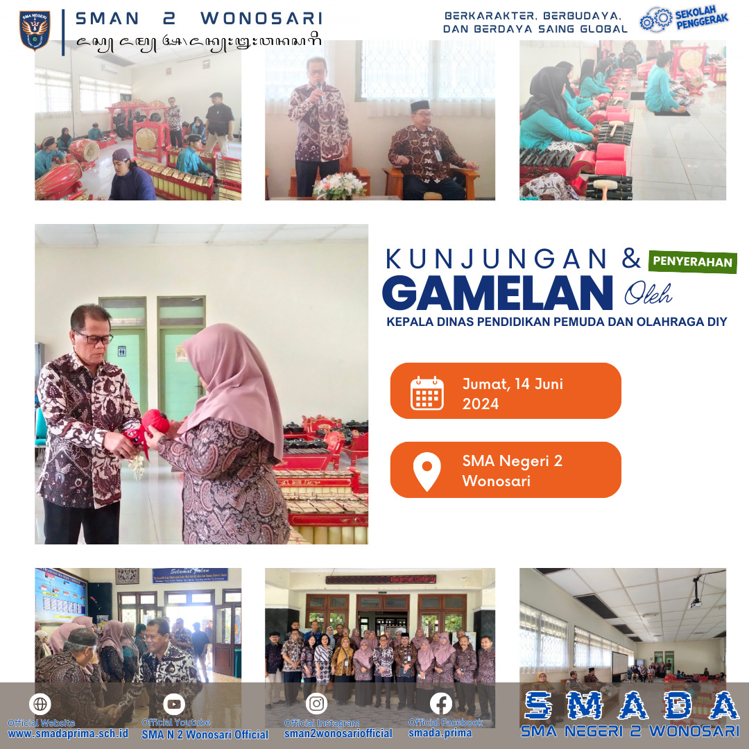 Wonosari, 14 Juni 2024 – SMAN 2 Wonosari, sekolah yang merupakan sekolah berbasis budaya, mendapat kunjungan istimewa dari Kepala Dinas Pendidikan Pemuda dan Olahraga (Disdikpora) Daerah Istimewa Yogyakarta (DIY), Bapak Didik Wardaya, SE. M. Pd., beserta rombongan. Kunjungan ini bertujuan untuk menunjang kegiatan budaya di SMAN 2 Wonosari, sekaligus menyerahkan perangkat gamelan yang telah diajukan oleh SMAN 2 Wonosari sejak tahun lalu. Acara ini berlangsung pada Jumat, 14 Juni 2024, pukul 09.00 WIB.