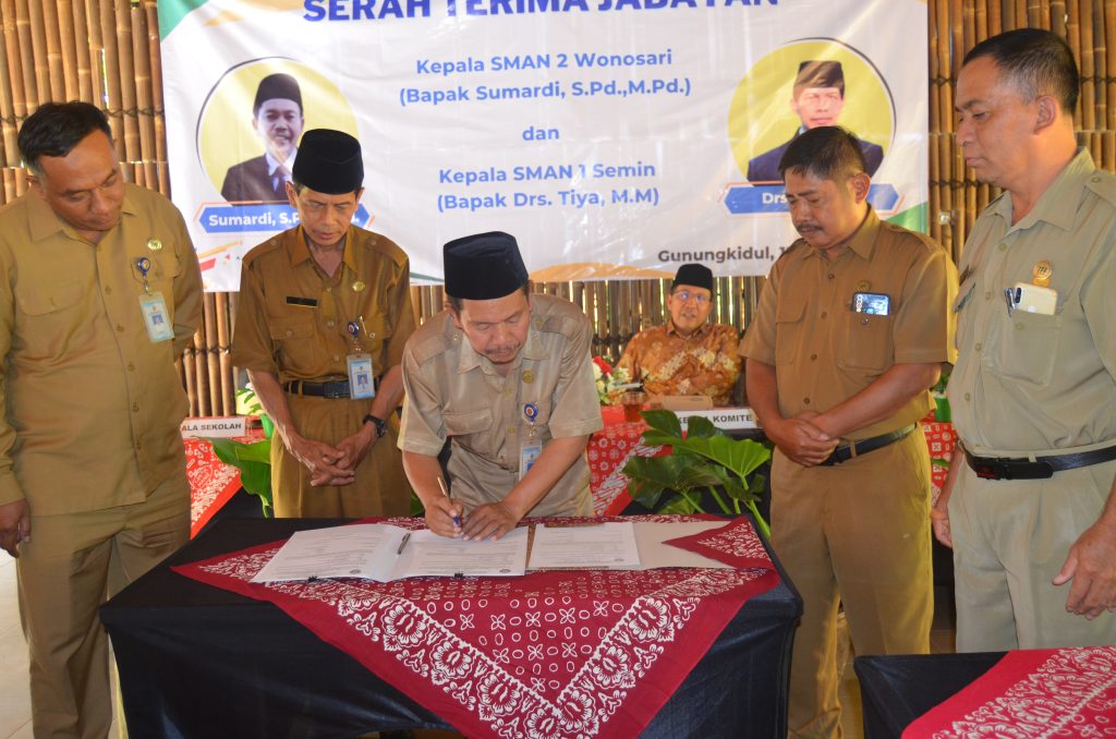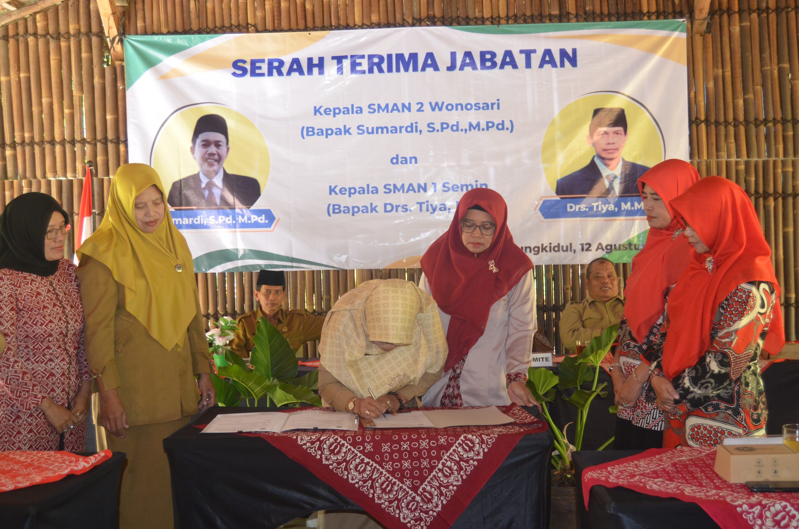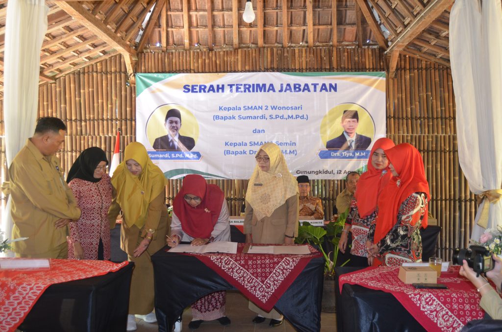 Berdasarkan Surat Keputusan Gubernur Daerah Istimewa Yogyakarta Nomor 155/Pem.D/UP/D.4 tanggal 1 Agustus 2024 tentang Penugasan Guru sebagai Kepala Sekolah di Lingkungan Dinas Pendidikan, Pemuda dan Olahraga Daerah Istimewa Yogyakarta, disebutkan bahwa diberhentikan dari jabatan lama sebagai Guru Ahli Madya yang diberikan tugas tambahan sebagai Kepala Sekolah SMA Negeri 2 Wonosari Balai Pendidikan Menengah Kabupaten Gunungkidul Dinas Pendidikan, Pemuda dan Olahraga DIY dan diangkat ke dalam jabatan baru sebagai Guru Ahli Madya yang diberikan tugas tambahan sebagai Kepala Sekolah SMA Negeri 1 Semin Balai Pendidikan Menengah Kabupaten Gunungkidul Dinas Pendidikan, Pemuda dan Olahraga DIY. Sehubungan dengan hal tersebut, maka SMA Negeri 2 Wonosari melaksanakan serah terima dan pisah sambut kepala sekolah. Kegiatan tersebut dilaksanakan pada Senin, 12 Agustus 2024 bertempat di Sego Abang Gunungkidul. Pada acara tersebut juga dilaksanakan serah terima jabatan Ketua Dharma Wanita. Kegiatan tersebut dihadiri oleh :